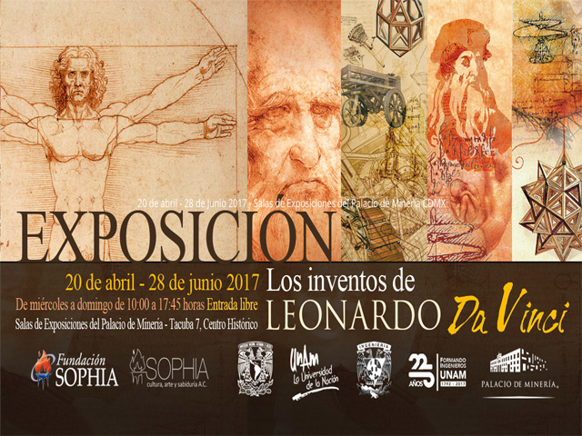 Organizada por Sophia -Cultura, arte y Sabiduría A. C – Fundación Sophia y la Facultad de Ingeniería de la UNAM – Palacio de Minería, para conmemorar los 225 años de la Facultad de Ingeniería de la UNAM, la exposición “Los inventos de Leonardo Da Vinci” ofrece un recorrido por algunos de los artefactos geniales diseñados por el celebérrimo pintor, escultor, arquitecto, científico, poeta, escritor, botánico, ingeniero e inventor renacentista.
