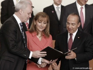 Felipe Calderón, Gloria Guevara Manzo, David Scowsill en la firma del Acuerdo Nacional para el Turismo 2011
